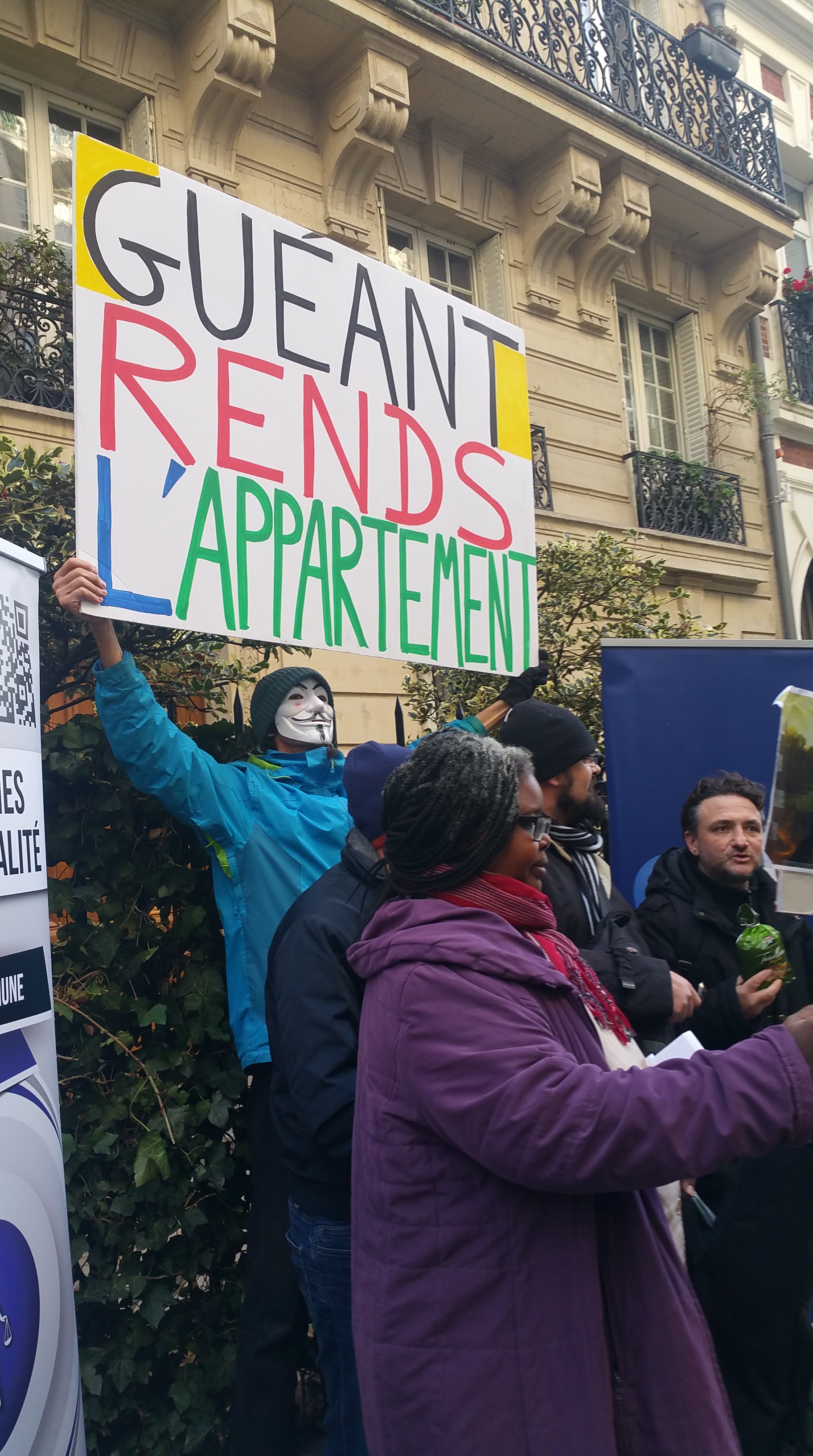 While shouting “Guéant, give the apartment back”, those four associations were gathering together in front of the apartment of the former Interior Minister, in order to claim for its restitution to the citizens.