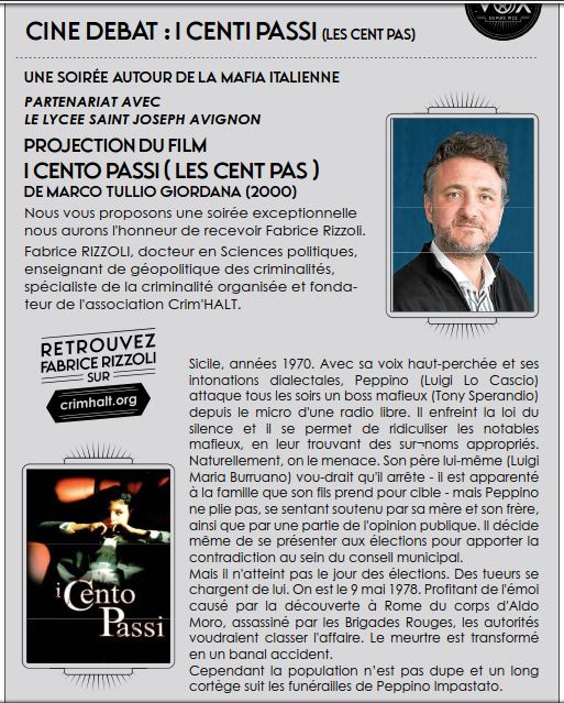 Le soir, grâce au cinéma le VOX, indépendant depuis 1922, Crim’HALT accompagnait le film « I Cento passi » retraçant la vie et la mort de Peppino Impastato, l’un des plus beaux exemples de rébellions citoyennes contre la mafia (cf. 2019 Crim’HALT accompagne « Les Cents Pas »)