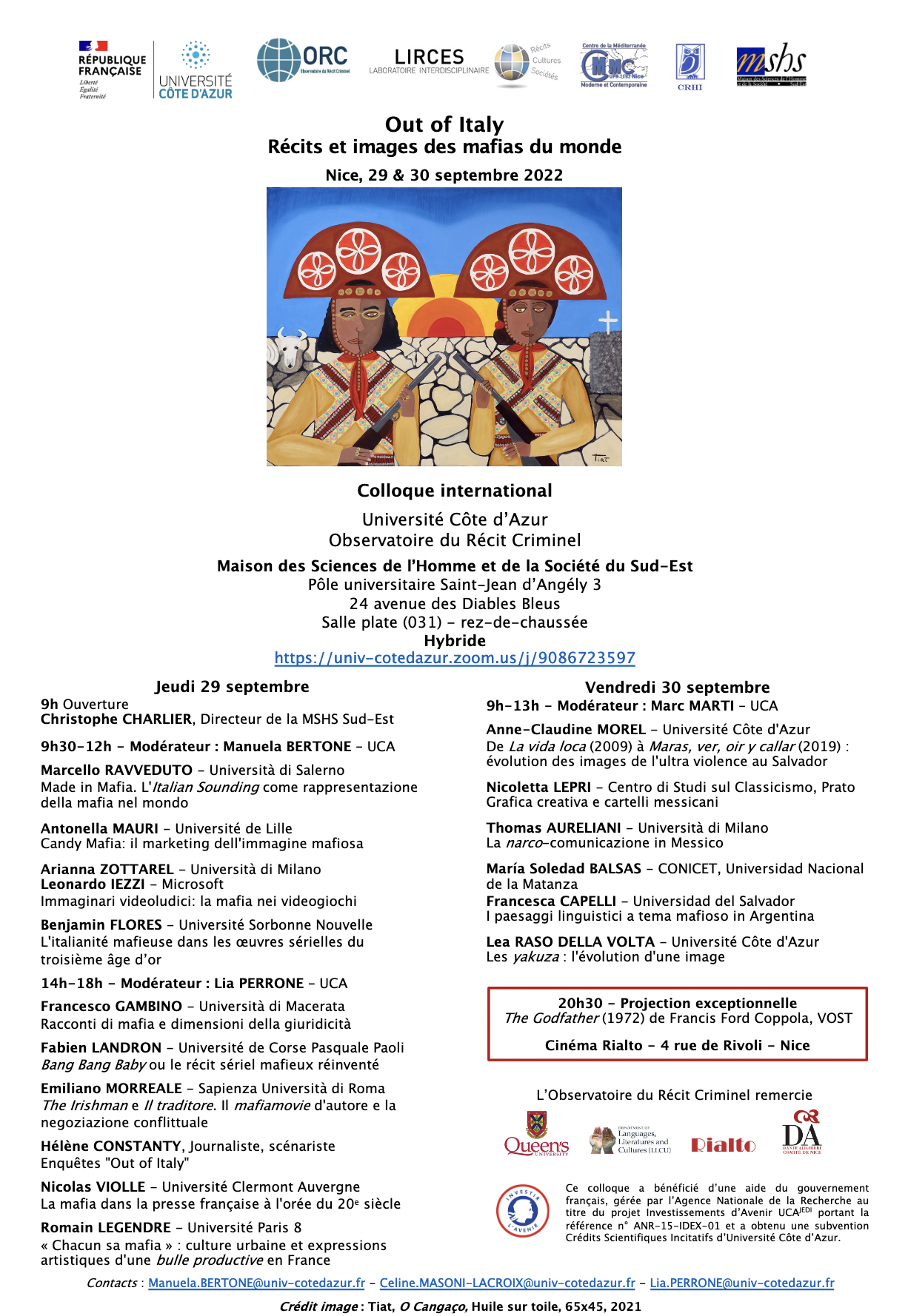 Crim’HALT était présent au colloque international « Out of Italy. Récits et images des mafias du monde » par l’intermédiaire d’Eléa GEFFROY, stagiaire au sein de Crim’HALT et étudiante en Master Géopolitique et Etudes Stratégiques à l’Université Carlos III de Madrid. Ce colloque a été organisé dans le cadre des activités de l’ORC (Observatoire du Récit Criminel / Osservatorio del Racconto Criminale) de l’Université Côte d’Azur les 29 et 30 septembre 2022.