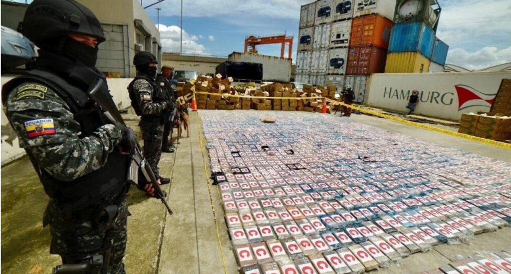 Source : La police de lutte contre les stupéfiants après une saisie de 3 tonnes de cocaïne dans un conteneur de bananes, dans le port de Guayaquil, en Équateur, le 1er avril 2022. © MARCOS PIN/AFP ; URL.