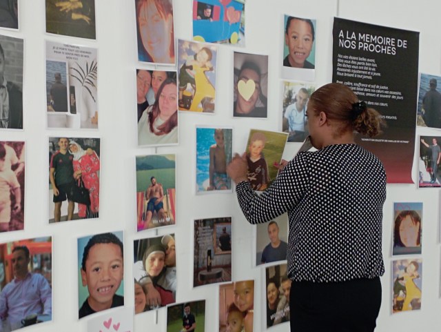 Photo : Laetitia Linon devant le mur des défunts installé en 2022 à la cité des associations de Marseille en amont d’une grande marche pour la justice et la paix organisée le 18 juin.