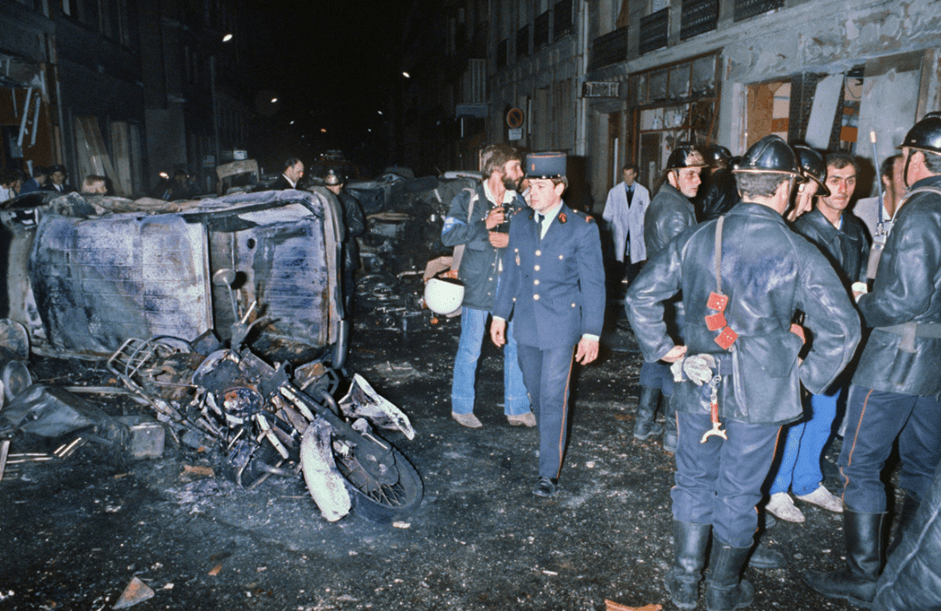 Des pompiers s’affairent, le 03 octobre 1980, à Paris, autour de véhicules détruits par l’explosion d’un engin explosif visant la synagogue de la rue Copernic.