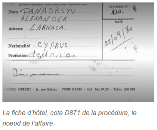 Petit à petit, dès ce premier jour d’audience, les témoins amènent des éléments qui nous guident directement aux coupables : la découverte de deux passeports chypriotes falsifiés. Les enquêteurs remontent jusqu’à la moto, achetée en liquide après sa remise en vente une semaine avant l’attentat dans un magasin de l’avenue de la Grande Armée. La personne qui l’achète a donné son identité : un homme dénommé Alexander Panadriyu. Il dévoilera résider à l’hôtel Celtic, dans le 8ème arrondissement de Paris.