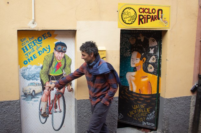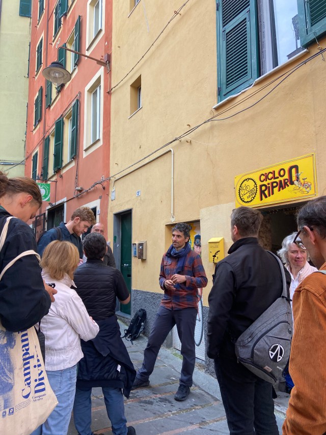 Vers 10h45, nous avons poussé la porte du CicloRiparo, un atelier vélo associatif installé dans un ancien local confisqué à la criminalité organisée et réattribué via appel d’offres lancé par la municipalité de Gênes. Nous y avons retrouvé Giacomo, bénévole passionné de vélos anciens, qui nous a fait découvrir ce lieu unique, cogéré avec la coopérative Il Ce.Sto dans le cadre du projet des Jardins Luzzati. Ici, on ne vient pas simplement faire réparer son vélo. On apprend à le démonter, à le entretenir avec peu de moyens, à comprendre comment ça fonctionne. Chaque réparation se fait sur rendez-vous, gratuitement, accompagnée de conseils pratiques et de savoir-faire transmis avec enthousiasme. L’atelier récupère également des vélos d’enfants, souvent jetés parce que les parents préfèrent en acheter un neuf. Après les avoir réparés, les bénévoles les déposent sur une place publique, à disposition, en don libre. Pour les vélos d’adultes, le principe est le même, à ceci près qu’ils sont prioritairement offerts à des livreurs à deux roues. Sont également organisée des ventes aux enchères de vieux vélos donnés par des particuliers : chaque vélo est remis en état avec soin, et les fonds récoltés permettent d’assurer une partie de l’autofinancement de l’association. Le CicloRiparo, membre du réseau FIAB, participe activement à la promotion de la mobilité douce et à la réflexion sur l’aménagement cyclable à Gênes. En un an, près de 100 vélos ont été remis en selle : un signe fort d’une demande croissante pour des déplacements plus durables. Avec son fonctionnement participatif et solidaire, le CicloRiparo montre que le vélo est bien plus qu’un simple moyen de transport : c’est un véritable outil de transformation sociale et urbaine – et un magnifique exemple de reconversion vertueuse d’un bien confisqué.