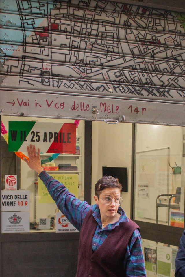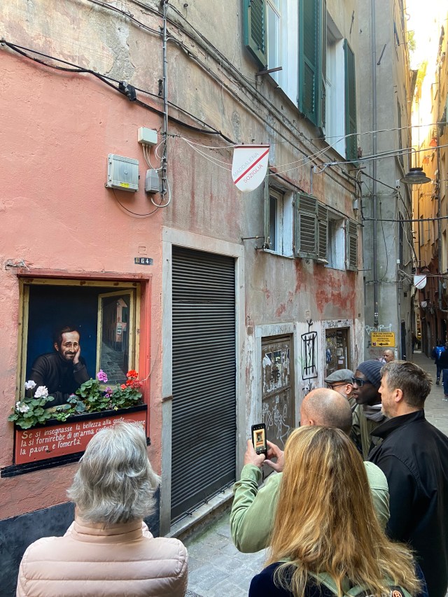 Vers 11h30, nous avons été accueillis par Margherita, bénévole engagée de la Fondation Gigi Ghirotti, au Info Point situé au 97r de la via Canneto il Lungo. Ce local, confisqué à la criminalité organisée et réattribué en 2019 par la municipalité de Gênes, a rouvert ses portes en 2021 sous une nouvelle forme : celle d’un espace d’information et d’écoute, au service des plus vulnérables. La fondation Gigi Ghirotti œuvre depuis des années pour soulager la douleur dans le cadre des soins palliatifs. Elle intervient aussi bien à domicile qu’en hospice, en accompagnant les patients et leurs proches par un soutien médical, psychologique, social et spirituel. L’ouverture de cet Info Point en plein cœur du centre historique permet de rendre ces dispositifs plus visibles, plus accessibles. Ici, les bénévoles informent, orientent et rassurent. Comme nous l’a expliqué Margherita, il s’agit d’un lieu de proximité, où chaque question peut trouver une réponse, chaque besoin un début de solution.