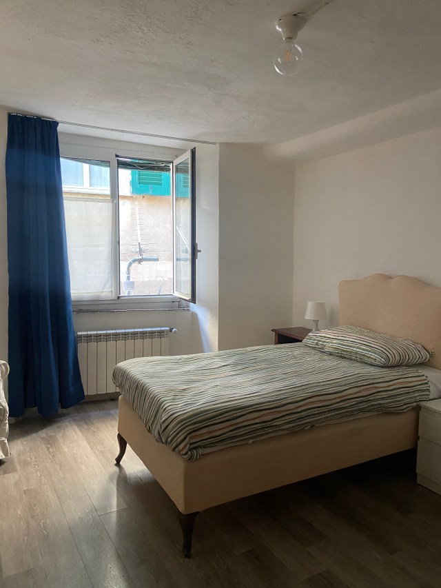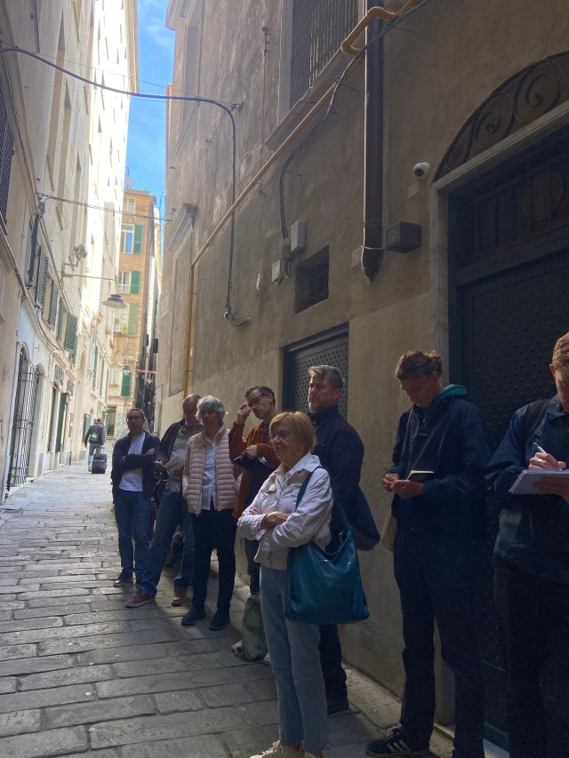 À 10h, nous avons poursuivi nos visites dans le centre historique avec un deuxième appartement confisqué. Aujourd’hui, il est affecté à la Fondation Auxilium pour héberger trois personnes en situation précaire. Nous y avons rencontré Riccardo, qui a passé près de dix ans dans la rue avec sa chienne Stella. Il vit ici depuis deux ans, avec deux colocataires. Grâce à son travail de cuisinier pour des colonies de vacances et des associations, il parvient à couvrir ses factures d’électricité – une étape vers l’autonomie et la reprise de responsabilités quotidiennes. Ce projet est porté avec l’appui quotidien des travailleurs sociaux de la coopérative Il Melograno. Contrairement à la philosophie du Housing First (un toit d’abord) désormais majoritaire en France, le modèle génois repose sur un parcours progressif : les personnes sont d’abord accueillies en hébergement d’urgence, puis peuvent accéder à un logement stable à condition de s’inscrire dans une dynamique active de réinsertion. Travailler, respecter certaines règles (comme l’interdiction d’alcool ou de stupéfiants) et démontrer leur volonté d’avancer sont les clefs de ce cheminement. Aujourd’hui, les trois habitants de l’appartement sont tous plus ou moins insérés professionnellement. L’un d’eux s’apprête même à quitter les lieux pour son propre logement, qu’il est désormais en mesure de payer seul, grâce à son salaire. Une belle illustration de ce que peut devenir un bien confisqué : un tremplin vers une vie nouvelle.