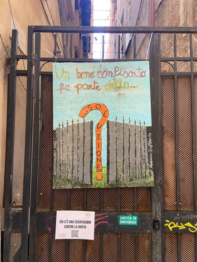 Ce matin, rendez-vous Piazza San Matteo, en plein cœur du centre historique, pour une activité un peu particulière : une escape room… dans un bien confisqué à la mafia. Nous avons été accueillis par Maddalena, bénévole et cofondatrice du projet, ainsi que par Inès, la mère de Stefano Matricardi, en mémoire duquel ce lieu a été transformé. Elles nous ont raconté l’histoire du bien : autrefois utilisé par la criminalité organisée, il est resté à l’abandon pendant plusieurs années après sa confiscation, avant de retrouver une nouvelle vie grâce à l’engagement d’un petit groupe d’anciens scouts du groupe Agesci Genova 13. Grâce à une campagne de financement participatif lancée en 2022, le local a été entièrement réhabilité et aménagé.
